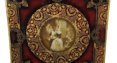 Raro prato espanhol decorativo em vidro, com uma cena elegante que remete ao charme vintage.